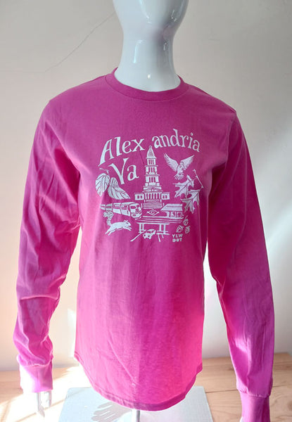 T-shirt, Unisex, printed in mostly white ink: Alexandria VA, image of the Masonic Temple, Amtrak train, a dove, a jumping squirrel, autumn leaves, a car in the underpass..