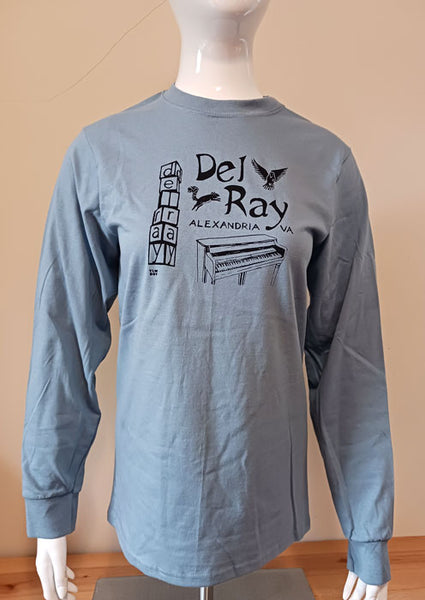 Cotton long-sleeved shirt, Printed with Del Ray, Alexandria VA, image of the Del Ray sculpture, the outdoor piano, a bird flying, a squirrel jumping.